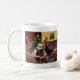 Père Noël à la maison avec son Carlin noir, se détendre devant le feu avant la grande nuit. Remarquez Mona Lisa sur le manteau tenant le même chien.