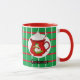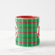 Que votre boisson de choix soit du chocolat chaud, du café ou du thé, cette tasse de vacances est pour vous. Le design a un arrière - plan vert avec des lignes rouges et blanches qui forment un motif de carré. Sur le fond et de la tasse se trouve l'image d'une tasse de chocolat chaud.