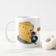 An adorable anime-style mouse cartoon character is seen casually leaning against a colossal slice of cheese, larger than the plate it sits on. The cheese is a golden-yellow color, with small holes scattered throughout. The mouse has a cute, friendly face, large eyes, and wears a stylish, slightly oversized cap.