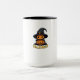 Cette tasse présente un design éffrayant sur le thème de l’Halloween avec une lanterne jack-o’ portant un casquette de sorcière. La citrouille a un visage sculpté et se trouve au-dessus du mot "HALLOWEEN" écrit en caractères gras et décoratifs avec un dégradé orange à jaune. Idéal pour savourer vos boissons chaudes préférées pendant la saison d'Halloween, cette tasse ajoute une touche festive et sinistre à votre collection de boissons.