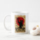 Ambiance audacieuse d'affiche vintage : un chat kaïju noir s'élève au-dessus d'une ville néon tandis que des avions vintage encerclent le soleil rouge, mélangeant humour ludique et esthétique rétro d'affiche de guerre.