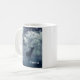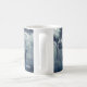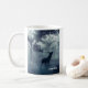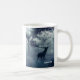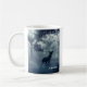 Une tasse avec la photo d'un cerf royal avec des bois debout dans une forêt ombragée au milieu d'arbres éclairés par le soleil. Neige tombant tout autour.