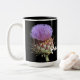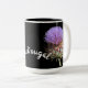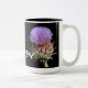 Le chardon mauve en fleur se démarque contre l'arrière - plan noir de chaque côté du nom dans le texte blanc courbé au milieu.