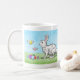 Le lapin de Pâques est avec les oeufs de Pâques volants prêts pour la chasse aux oeufs de cette année.