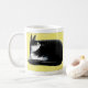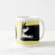 Un stylisé, couleur, dessin de bande dessinée d'un chat de smoking, s'est accumulé de beaucoup de lignes fines hachées. Le chat est courbé, remplié dedans, il est queue à travers la base du dessin. L'arrière - plan sur cette variation d'impression est jaune.