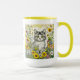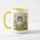 Art folklorique art ai art représentant un chat gris et blanc mignon assis dans des fleurs jaunes et blanches. Citation de chat doux.