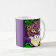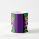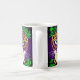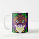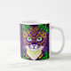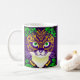 Tasse à café à l'image d'un mignon chat orné d'un masque aux couleurs festives de Mardi Gras. Le mélange de violet, de vert et de jaune doré reflète les teintes traditionnelles de la célébration
