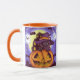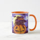 Ce design présente un chat sorcier sur un citrouille géant, avec un arrière - plan bleu/violet avec deux fantômes
