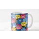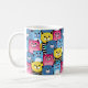 Une tasse colorée avec un motif ludique de chats de dessins animés dans différentes couleurs et expressions.