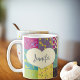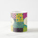 Cette jolie tasse est prête à être personnalisée avec un nom en écriture script ou cursive et dispose d'une couleur crème de forme de coeur ensemble contre une illustration dans le style d'une courtepointe boho colorée patchwork. Le coeur et le nom apparaissent de part et d'autre de cette tasse.