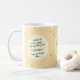 Bouge à café léger pour quelqu'un qui suit des traitements de chimiothérapie. Le texte sur la tasse dit "Je promets de ne pas dire à quiconque que vous aviez déjà un "cerveau chimio" avant de commencer la chimio..." Typographie manuscrite avec petits coeurs noirs contre un arrière - plan jaune moelleux.