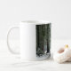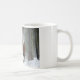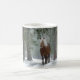 Une tasse avec la photo d'un cheval brun avec une longue crinière blanche. Debout dans une forêt avec des flocons de neige qui tombent tout autour.