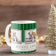 Chien Pet 3 Photo Collage Joyeux café de Noël Mug. Chic et moderne chien de Noël tasse photo de vacances avec 3 photo collage, Joyeux Noël et un texte personnalisé. Ajoutez trois photos. Personnalisez le texte comme vous le souhaitez ou supprimez-le. L'arrière - plan dispose d'un arrière - plan vert à rayures blanches. Grand comme un cadeau de Noël ou une tasse de gardien pour vous-même.