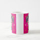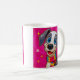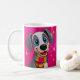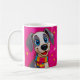 Adorable illustration de chien cartoon avec de grands yeux bleus, un large sourire et une écharpe colorée. Design vif et joyeux sur fond rose tourbillonnant, parfait pour mugs, t-shirts, posters et articles kawaii ou enfants.