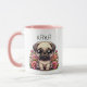 Cute chibi dessin douillet petit chien chiot carlin assis dans des fleurs roses avec un nom que vous pouvez ajouter dans l'espace personnalisé.