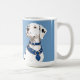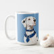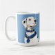 Illustration stylisée d'un chien dalmate portant un collier bleu contre un arrière - plan bleu clair, soulignant son apparence marquée et son comportement amical.
