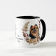 Une jolie couronne d'automne dans les tons marron, brun et crème de cannelle entoure l'image aquarelle d'un adorable Chien Poméranie noir et rouge. L'image est imprimée deux fois sur la tasse, avec votre texte personnalisé entre eux.
