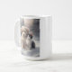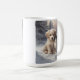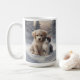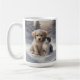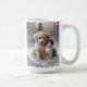 Tasse à café avec un adorable chiot et chaton posant dans la neige.