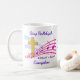 Modern SING HALLELUJAH CHRIST IS RISEN Christian Easter Coffee Mug with CUSTOMIZABLE NAME AND MONOGRAM, showing a gold colored empty cross in amongst colorful music staves. The Easter text appears in a mauve color. These words will be sung by Christians the world over to celebrate the resurrection of our Lord Jesus Christ at Calvary. This modern Christian Easter mug would make a great gift for birthdays, at Christmas, throughout the year, but particularly for Easter. Choose from a wide selection of Christian Easter designs on cards, invitations, home decor, clothing and gifts, designed by Berean Designs. Matching Christian gifts available.