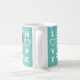 Christian turquoise et blanc AMOUR ESPOIR CROIRE Couples Photo Café Mug avec les mots HOPE et CROIRE sur le devant, plus un extrait basé sur 1 Corinthiens 13:7-8 - AMOUR NE FAILLE JAMAIS sur le dos. Le O dans HOPE et dans LOVE est remplacé par un coeur. Il y a Ecriture PERSONNALISABLE de 1 Corinthiens 13:7-8 suivie d'un NOM(S) DE PLACEHOLDER. Vous pouvez le remplacer par votre version biblique préférée et votre nom. Téléchargez votre photo préférée sur le devant. Un cadeau idéal pour les couples, les Anniversaires, les Mariages, les Valentins, les Anniversaires et Noël. Le jeu de couleurs est la typographie BLANCHE sur un arrière - plan TURQUOISE LUMINEUX moderne.