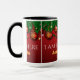 A warm and festive Christmas-themed design featuring lush green pine branches hanging from the top, decorated with elegant red ornaments adorned with golden snowflakes and zig-zag patterns. Small stars, snowflakes, candy canes, and holly berries add extra holiday charm. The background is a smooth gradient of deep red, giving the artwork a cozy seasonal feel. At the center, the phrase “I AM HERE” appears in a classic white serif font, with the name “Lolo” below it in a soft yellow-orange gradient, creating a cheerful and personalized touch.