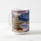 Serene Christmas holiday landscape scene with decorated Christmas tree in the midst of a village in early evening.