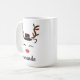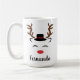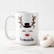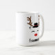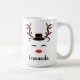 Mignons rennes de Noël à nez rouge portant un casquette noir perché au-dessus de ses bois. Un design de Noël avec un visage de rennes de vacances sucrés avec des bois bruns et un casquette noir avec une bande rouge au-dessus des yeux noirs et un nez rouge, un design de vacances amusant pour siroter du café, du chocolat chaud, du cacao, ou un soupçon de Cheer de Noël. N'oubliez pas de changer le nom des deux côtés de la tasse, ou d'ajouter un message personnalisé.