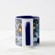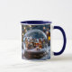 A Christmas personalized coffee cup with beautiful snow globes featuring Santa Clause, Reindeer, Christmas tree and a vintage train.