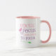 Cute Fun Pastel Witch Hocus Pocus Halloween Broomstick Coffee Mug, Profitez de vos vacances avec cette jolie tasse d'Halloween personnalisée et éffrayante. Le design stylisé de typographie comprend "Hocus Pocus I need coffee to focus" libellé rose et violet, et vert sorcier broomstick, rose sorcière, en arrière - plan blanc. rose Halloween sorcière