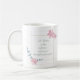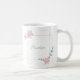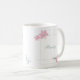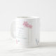 Cette jolie tasse est parfaite pour la fête des Mères ou comme cadeau pour la mère de la mariée. D'un côté se trouve la phrase "Une mère est comme une fleur - chacune est belle et unique" à l'intérieur d'un cadre géométrique doré orné de fleurs aquarelles roses et de feuillage bleu-vert. Le motif géométrique floral est répété de l'autre côté avec un champ personnalisable pour son nom. Au centre de la tasse, entre les deux cadres, se trouve un petit élément de feuillage et de fleurs assorti. Le texte est présenté dans une élégante police de caractères cursive bleu-vert.