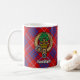 Clan Hamilton crête badge entouré d'une sangle et boucle sur l'arrière - plan tartan rouge. Texte personnalisé des deux côtés.