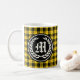 Tasse à café avec tartan pour Clan MacLeod et ses septs, y compris MacCabe et Tolmie, un plaid écossais populaire en jaune vif avec des accents noirs et rouges. Les deux côtés de la tasse disposent d'un badge rond noir avec votre initiale monogramme dans une police Old English, entouré de lauriers.