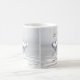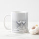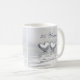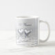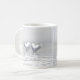 Tasse à café avec mon oeuvre d'art simple mais jolie couleur argent de deux coeurs d'argent flottant sur l'eau. Le texte personnalisable dit "25 ans".