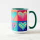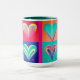 Commencez votre journée par une explosion de couleurs ! Cette tasse accrocheuse présente quatre coeurs stylisés et audacieux disposés en motif de grille. C'est un parfait exemple pour les amateurs de café et les amateurs d'art. Éclairez votre routine matinale ou offrez-la à quelqu'un qui aime les designs audacieux et joyeux!
