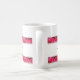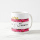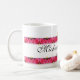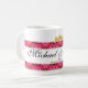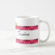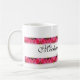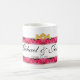 Avec une œuvre d'art originale de ZoeSPEAK conçue pour les amoureux, ce mug est bordé en haut et en bas par une bande de roses roses et de cœurs dorés. Au centre de la bande supérieure de roses, il y a deux rubans dorés qui forment un cœur où ils se rejoignent au centre. Deux cœurs dorés rejoignent les rubans au centre, complétant le design. Les noms du couple sont en écriture noire sur le fond blanc entre les roses, avec la date spéciale en dessous. Tout le texte est personnalisable.