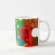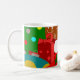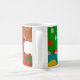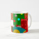Cette tasse a une conception de Noël d'un collage d'un arbre de Noël, d'un ornement, d'un bas, d'un cadeau et d'un garçon en pain d'épices.