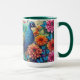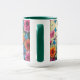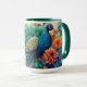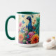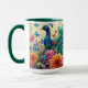 Cette tasse à café a deux paons entourés de fleurs. Tout est coloré.
