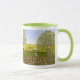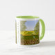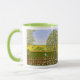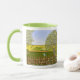 Un mug avec une belle image d'un paysage naturel : un oiseau perché sur une clôture patinée, des fleurs sauvages poussant autour de la clôture, un agriculteur sur un tracteur, travaillant sa terre, des arbres avec des feuilles et des terres agricoles aux couleurs variées. L'arrière-plan et l'image peuvent être personnalisés. Du texte peut être ajouté. Œuvre originale de W.B.