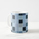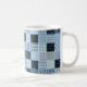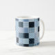 Conception de surfaces composées. Motif en patchwork sans couture de carrés cousus avec différents ornements géométriques. Impression textile en bleu.