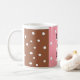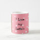 Cute polka dot mug dit 'I love my Lattes' (J'aime mes lattes) Faites un beau cadeau ou super pour un amateur de café. PInk et brun avec pois blancs