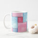 Une jolie tasse à café blanche avec patchwork de motif denim rose et bleu, d'une aquarelle peinte à la main par Judy Adamson.