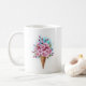 Cône gaufre douce avec fleurs de cerisier japonais rose frais sur arrière - plan blanc avec stries d'aquarelle bleue. Cerise japonaise rose.