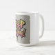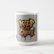 Un design de tasse dynamique et coloré avec le texte "Keep the Change" dans une police audacieuse et attrayante. Le texte est affiché dans une variété de couleurs et de motif, ce qui en fait un ajout amusant et amusant à toute cuisine ou table.
