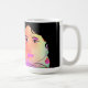 Very colorful drawing of woman's face on mug. Black and pink with green. Contemporary.