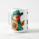 Illustration colorée d'un coq portant un casquette de cowboy turquoise entouré de fleurs turquoise et de tournesols luxuriants, mêlant charme rural et flair artistique.