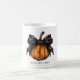 A cute coquette pumpkin with bow mug design . Perfect for Thanksgiving, celebrating autumn, and the cozy vibe we need when the weather turns brisk! Time for pumpkin lattes and hot chocolate. Burt orange wood, foliage, and pumpkin with bow.