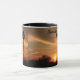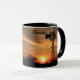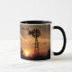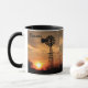 Une photo d'un coucher de soleil de Kansas avec un ciel coloré et des nuages. Avec une silhouette de moulin à vent, brillante et colorée, qui est sur un Coffee MUG.