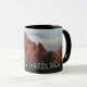 Blanc et noir 11 oz. mug combiné avec une image de plusieurs formations rocheuses rouges à Sedona, Arizona illuminé par un coucher de soleil extraordinaire rouge et orange. Voir le pot de bonbons assorti, plaque en papier, carreaux en céramique carré et dessous de verre. Voir la collection Arizona Mug dans la section HOME.