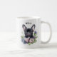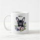 Mug de chien français carlin noir personnalisé avec un design floral dans un style aquarelle. Avec des fleurs violettes, bleues et roses et un adorable chiot. Vaisselle de cuisine pour les amoureux des animaux de compagnie.