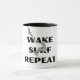 Cette tasse présente un design graphique dynamique d'une personne qui surfe, avec une vague stylisée en dessous et un oiseau volant au-dessus. Les mots "RÉPÉTER LE SURF DE RÉVEIL" sont affichés en caractères gras au-dessus et au-dessous du surfeur. Ce design capte l'excitation et l'excitation du wake surf, ce qui en fait un choix parfait pour les amateurs de sports nautiques.